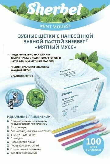 Зубные щетки Sherbet одноразовые с нанесенной зубной пастой, 100 шт / уп. «Мятный мусс» с ксилитолом. Цвета в упаковке: желтый, зеленый, синий, оранжевый, фиолетовый.