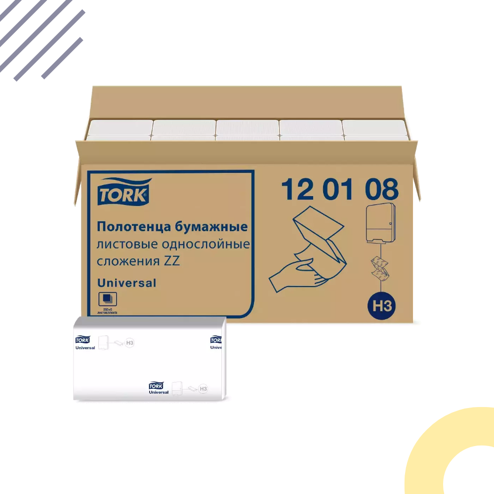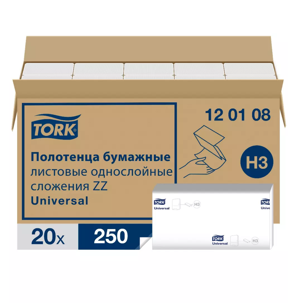Промо H3 Tork Universal листовые полотенца сложение ZZ, Система H3 - Полотенца сложения ZZ и С, 23см х 23см., 1 слойные, белые с тиснением , 5000 листов, 20 штук в коробке (120108)