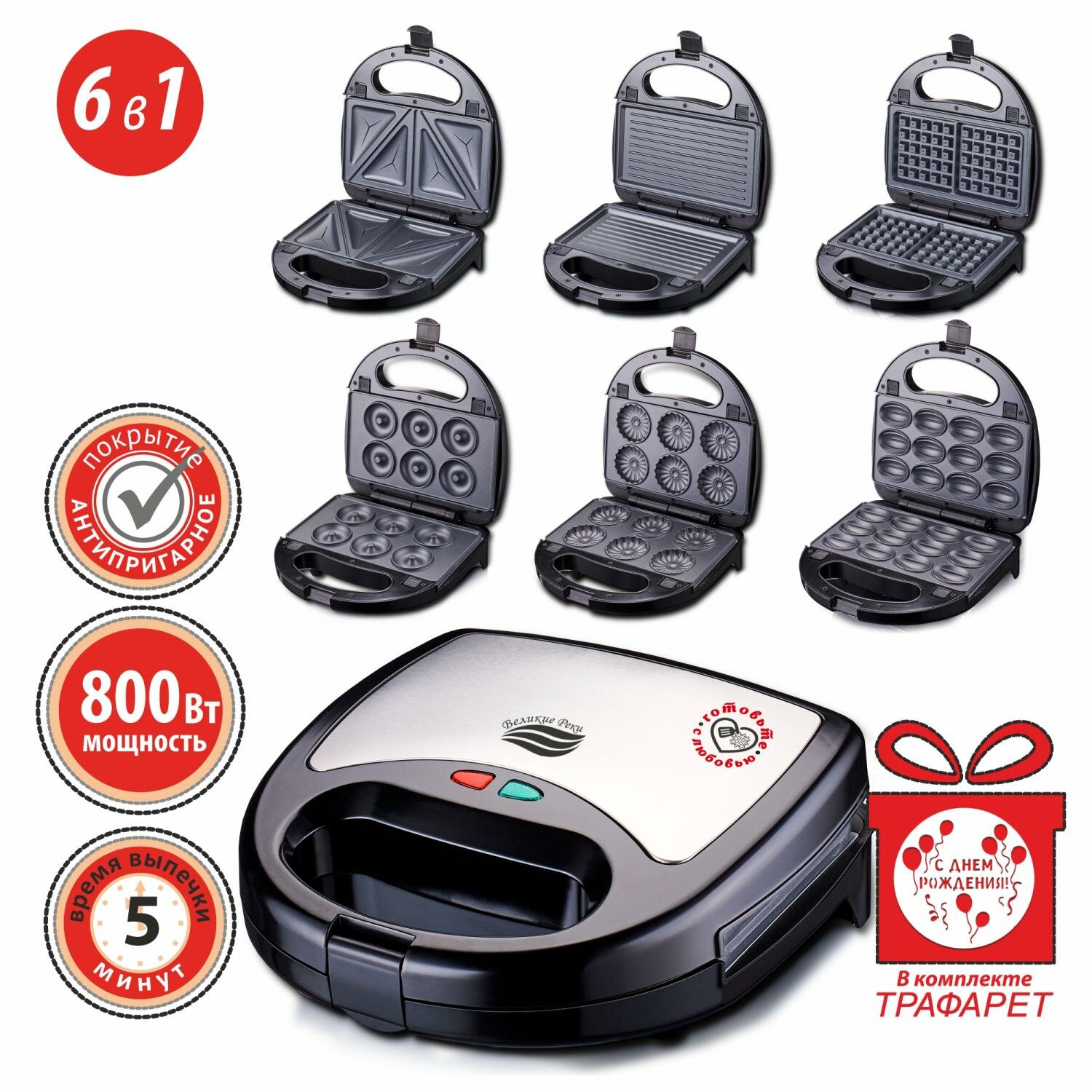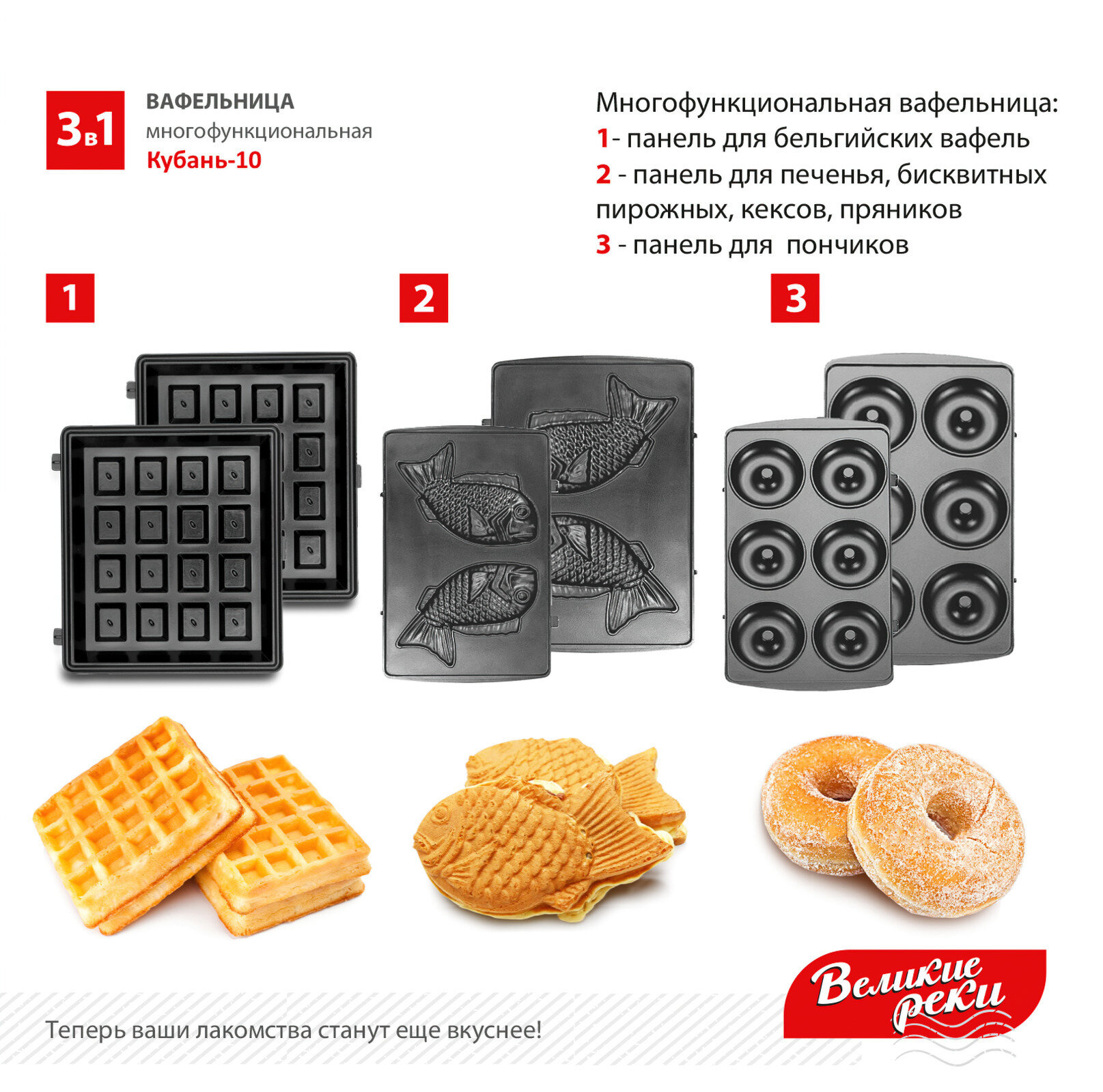 Вафельница Великие Реки Кубань-10 черная, 6 в 1,съемные панели,800 Вт,трафарет для сахарной пудры