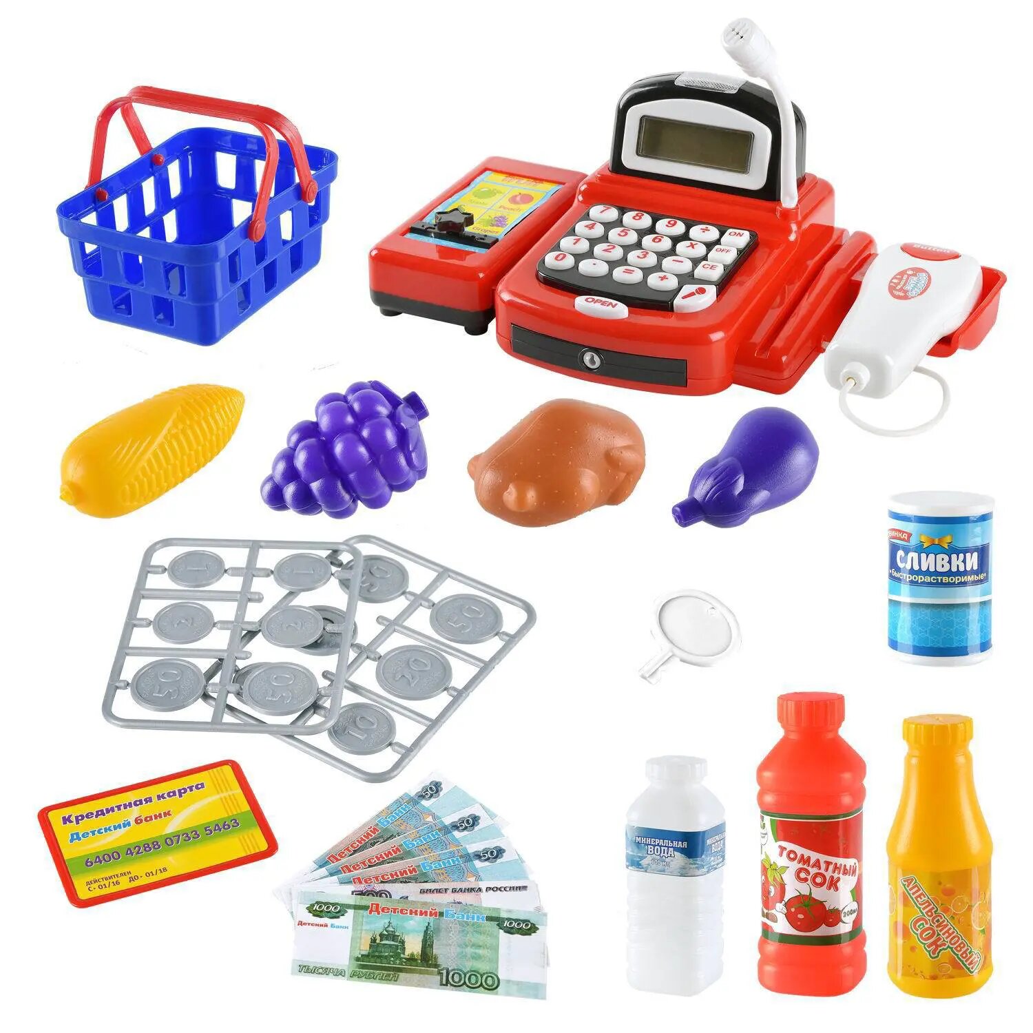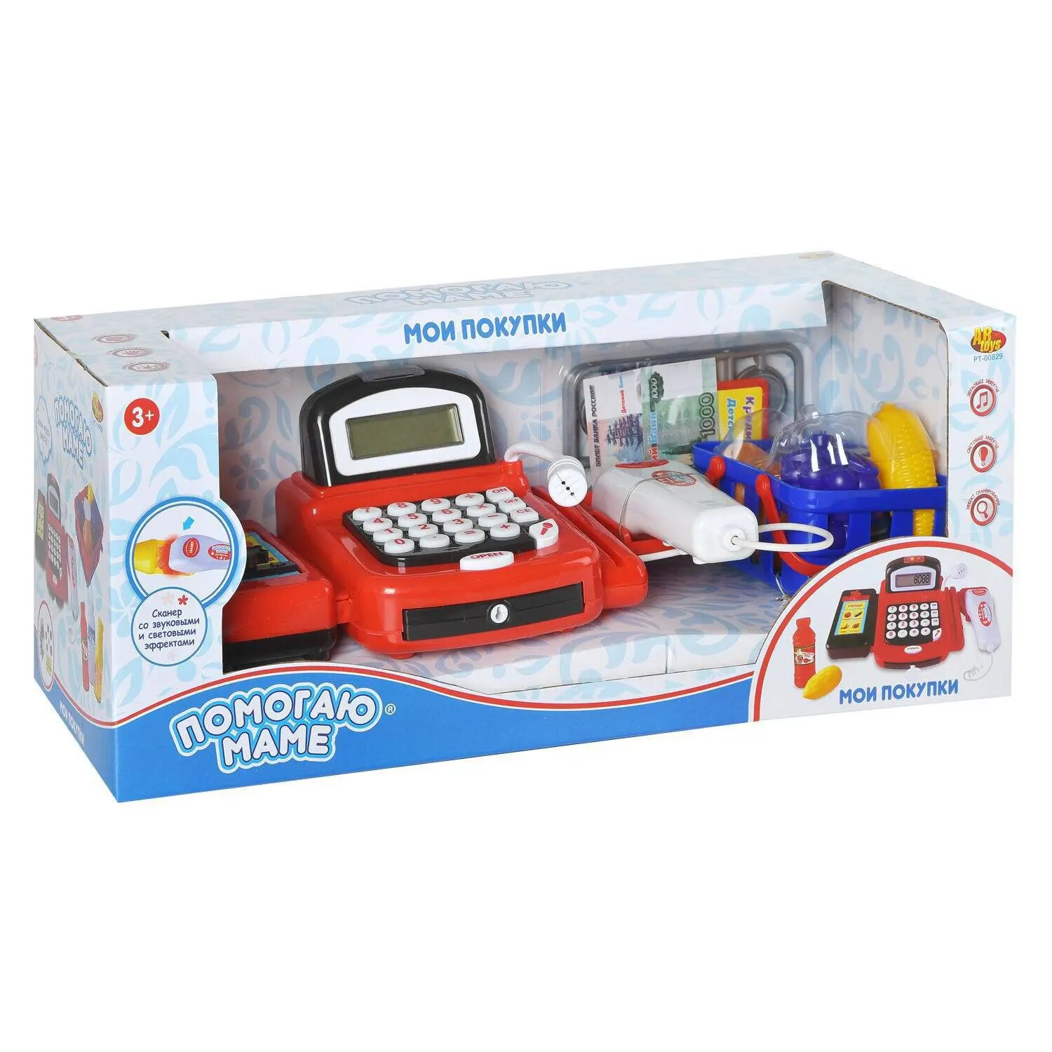 Купить Касса "Помогаю Маме", в наборе с продуктами и аксессуарами (31 предмет), с эффектами, на батарейках PT-00829