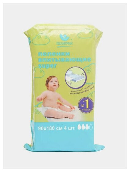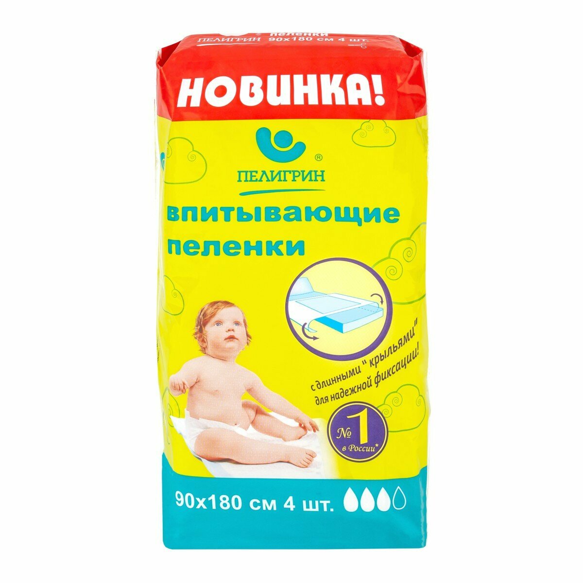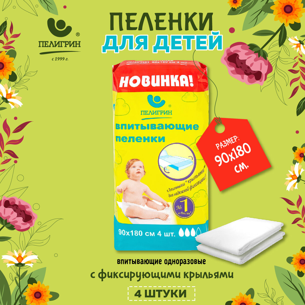 Пеленки одноразовые впитывающие для детей Пелигрин, с фиксирующими крыльями, 90х180 см, 4 шт.