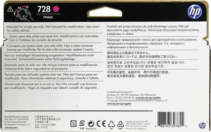 Картридж для печати HP Картридж HP 728 F9J66A вид печати струйный, цвет Пурпурный, емкость 130мл.