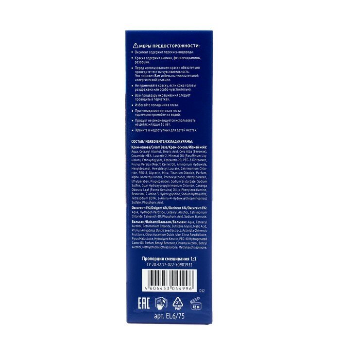 | Дополнительная информация | тест на чувствительности: приготовьте смесь из небольшого количества крем-основы и такого же объёма оксигента, перемешав их в любой неметаллической посуде. Не следует готовить весь объем краски. Нанесите приготовленную смесь на небольшой участок кожи на внутренней стороне локтевого сгиба или за ухом и оставьте на 10-15 минут. Затем смойте. Если в течение суток признаки аллергической реакции не появились, можете использовать краску |