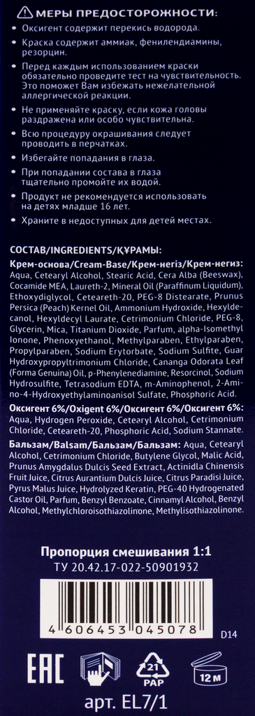 | Дополнительная информация | тест на чувствительности: приготовьте смесь из небольшого количества крем-основы и такого же объёма оксигента, перемешав их в любой неметаллической посуде. Не следует готовить весь объем краски. Нанесите приготовленную смесь на небольшой участок кожи на внутренней стороне локтевого сгиба или за ухом и оставьте на 10-15 минут. Затем смойте. Если в течение суток признаки аллергической реакции не появились, можете использовать краску |