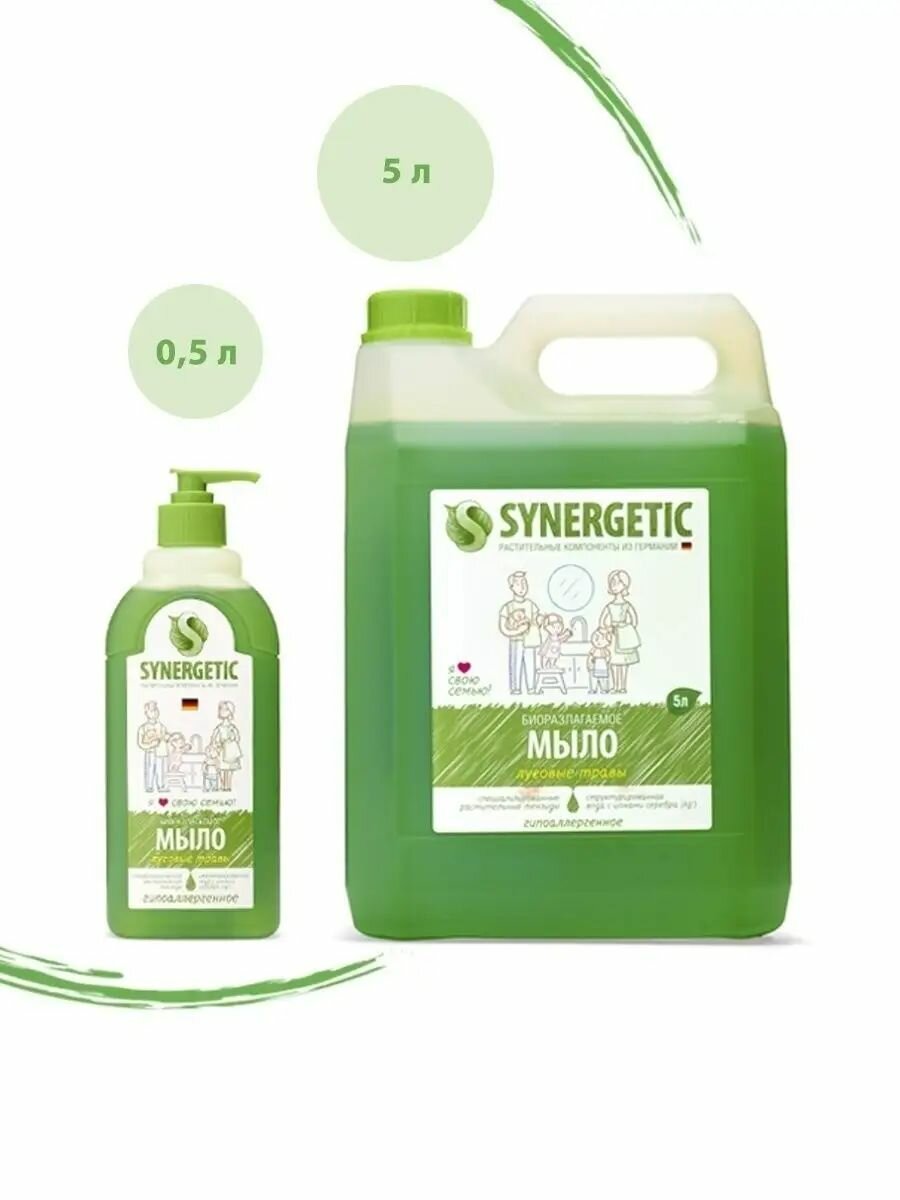 Мыло жидкое Synergetic, "Луговые травы", биоразлагаемое, гипоаллергенное, с дозатором, 500 мл (комплект из 5 шт)
