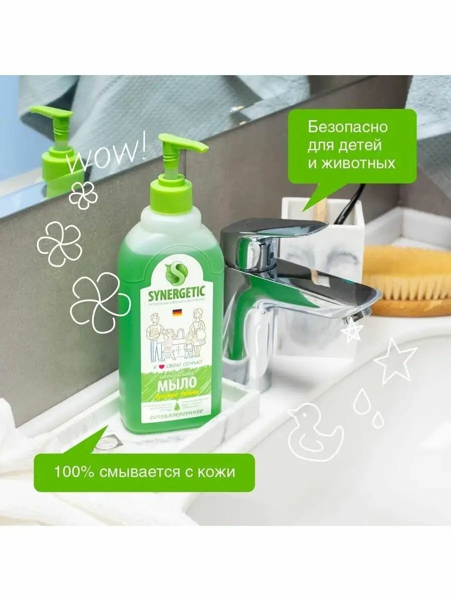 Мыло жидкое 500 мл SYNERGETIC «Луговые травы», гипоаллергенное, биоразлагаемое, дозатор