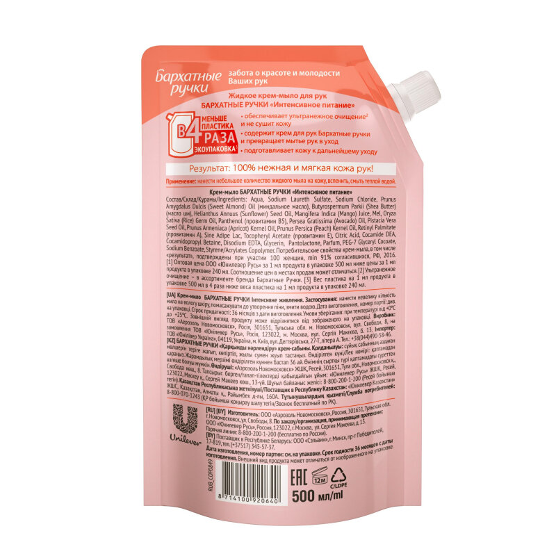 Жидкое крем-мыло Бархатные Ручки Интенсивное питание (запасной блок), 500 мл