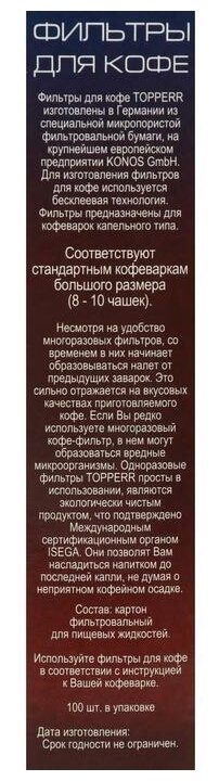 Ниже Вы можете прочитать отзывы на Topperr Фильтр бумажный для кофеварок №4 Topperr 100шт, неотбеленный, ознакомится с подробными характеристиками, посмотреть интересные обзоры и фотографии на Topperr Фильтр бумажный для кофеварок №4 Topperr 100шт, неотбеленный.