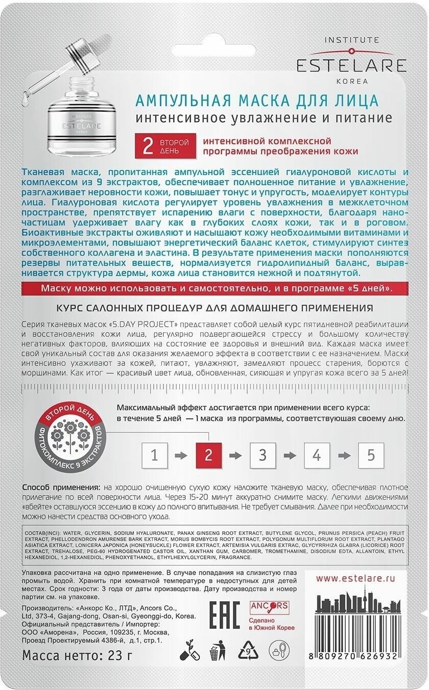 Купить Estelare Ампульная маска (5дней) для лица 2 день "Интенсивное увлажнение и Питание" 23 г.