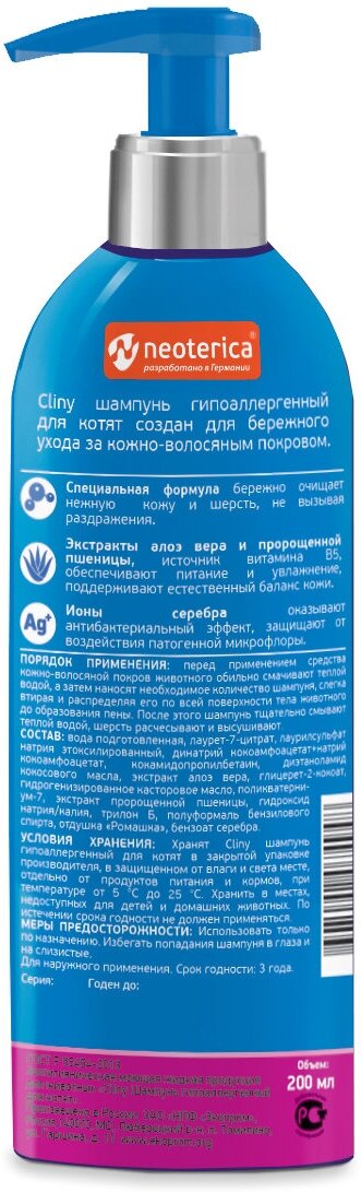 Шампунь Cliny "Бережная забота" для котят, гипоаллергенный, 200 мл