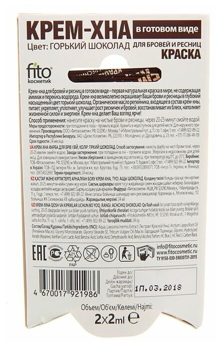 Фитокосметик Краска для бровей и ресниц крем-хна цвет горький шоколад 2x2 мл. (Фитокосметик)