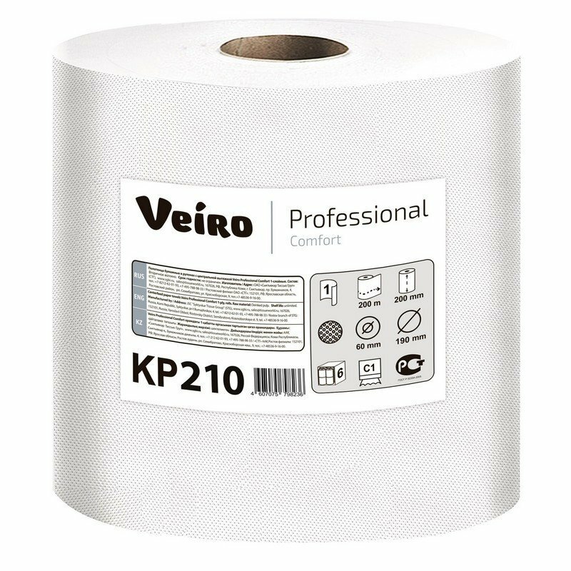 Бумажные полотенца в рулоне с центральной вытяжкой Veiro Professional Comfort KР210 200 м (Система POD, С1), белые, 1 слойные, комплект 6 рулонов