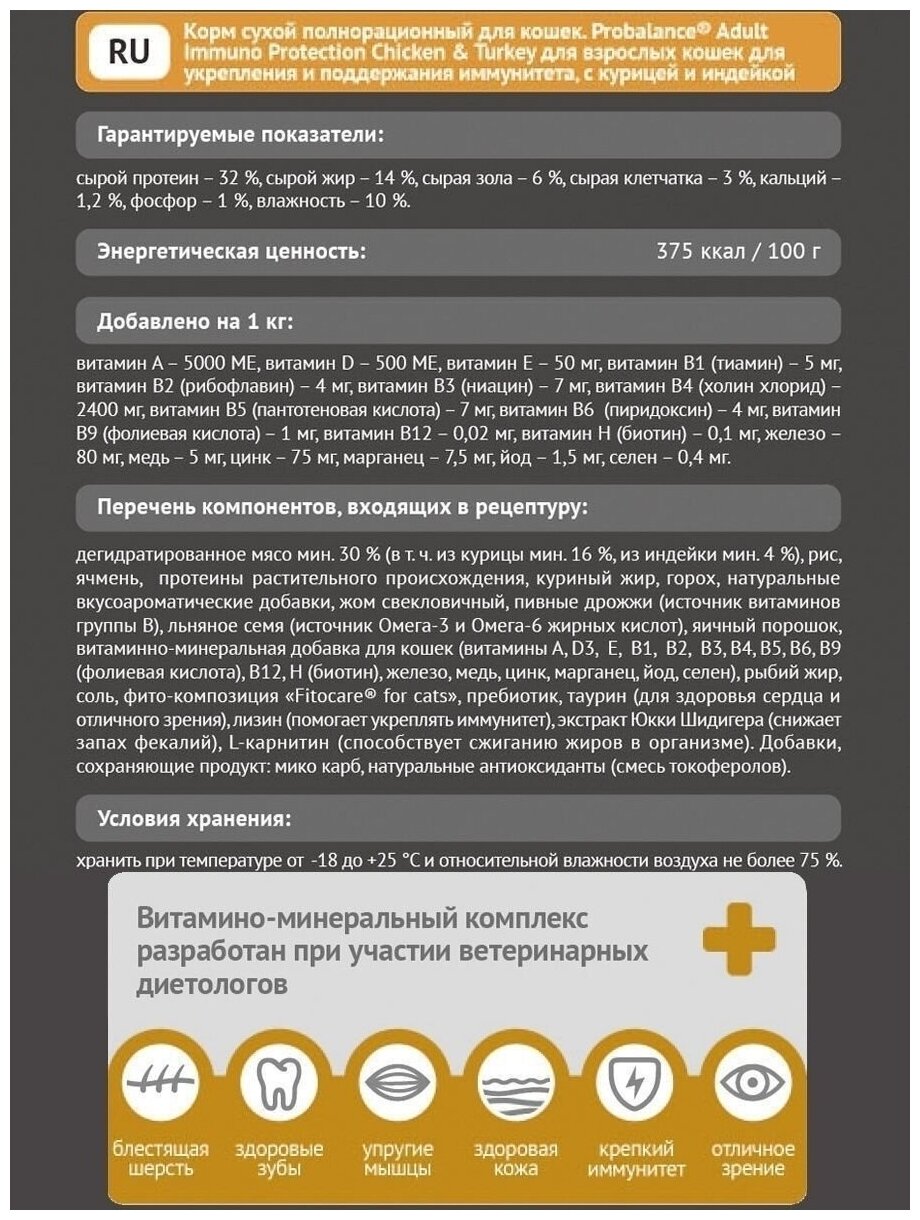 Probalance Сухой корм для кошек укрепление и поддержание иммунитета с курицей и индейкой 32 PB 652 0,4 кг 54840 (10 шт)