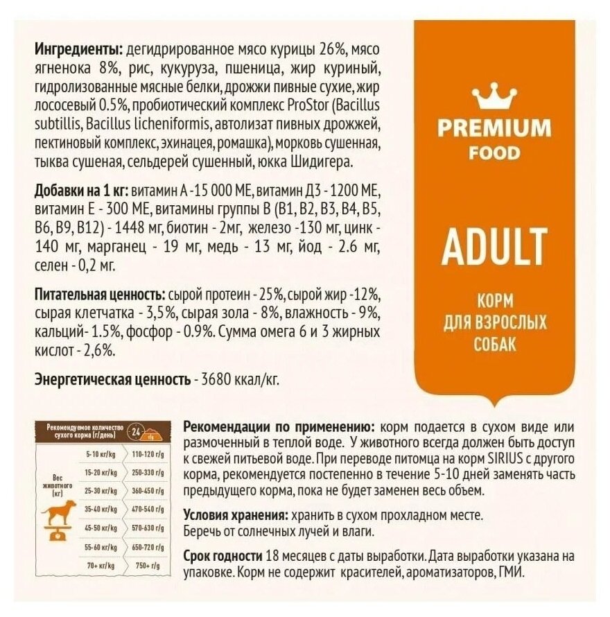 Сухой корм сириус SIRIUS PREMIUM для взрослых собак всех пород, ягненок с рисом, 2 кг