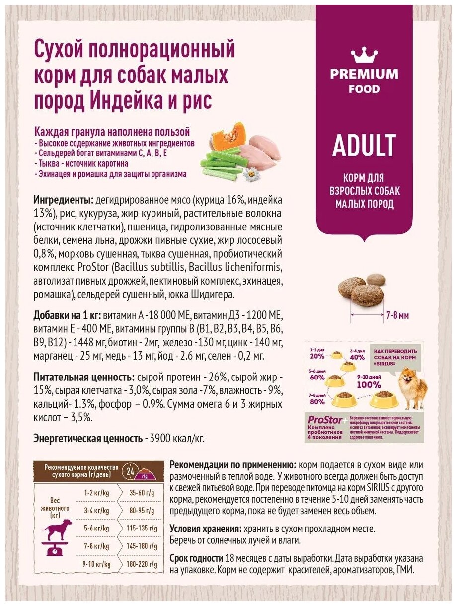 Sirius сухой корм для собак мелких пород с индейкой 2 кг.!
