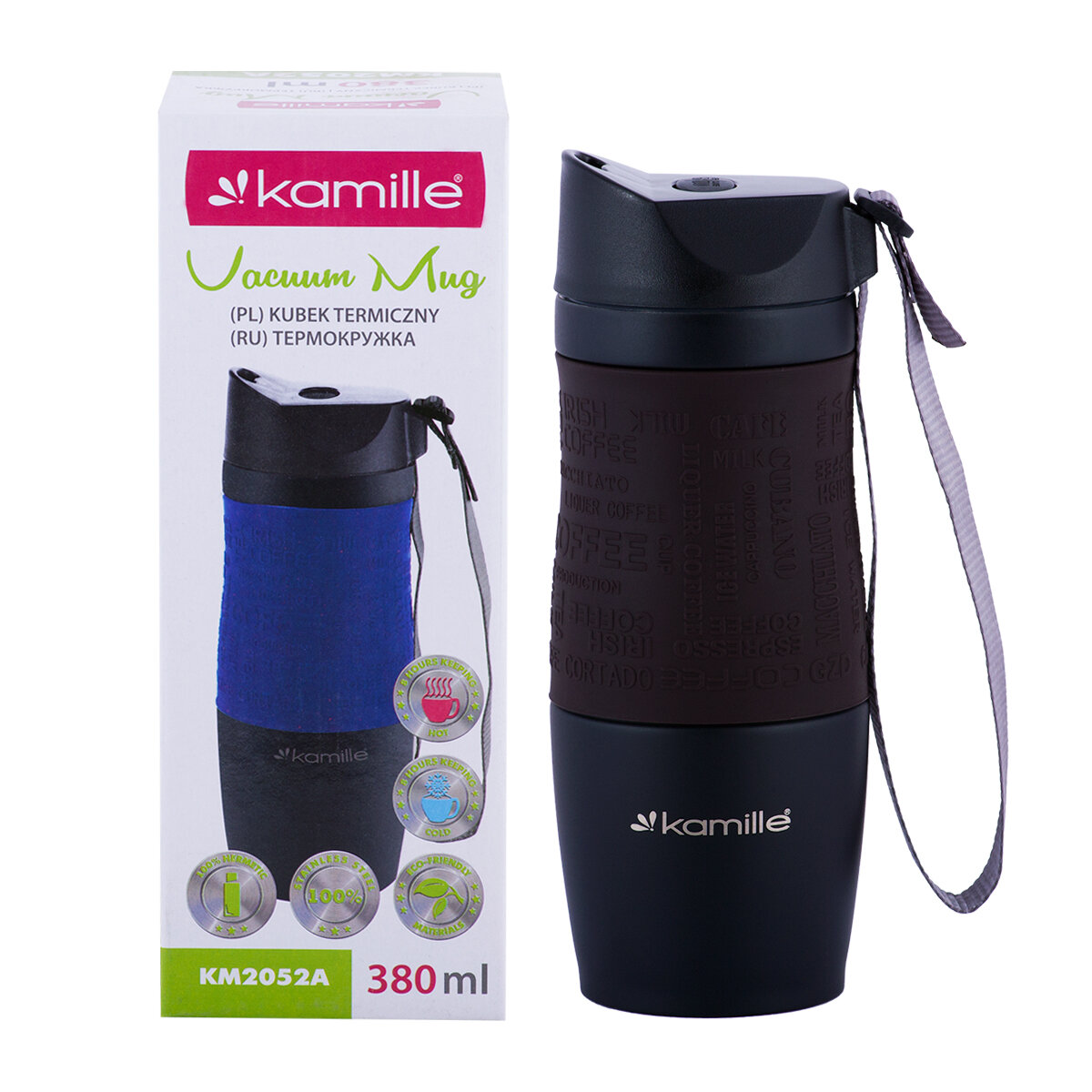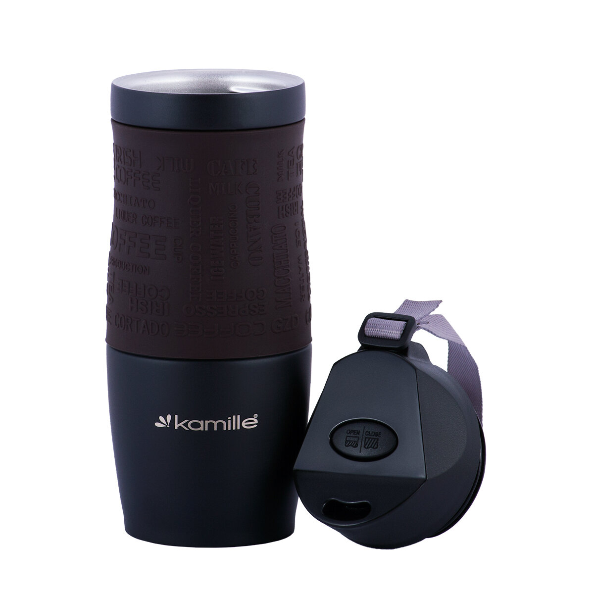 Термокружка 380 мл. из нержавеющей стали Kamille KM 2052A с TPR-вставкой и ремешком (2052A / коричневый)
