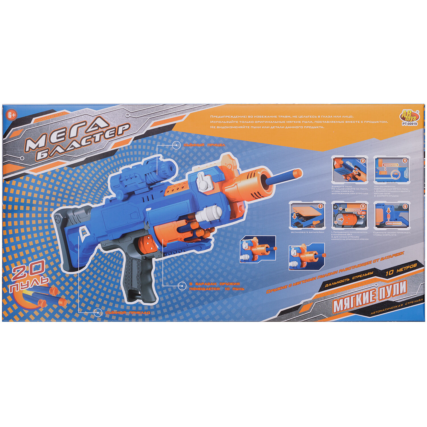 Бластер Abtoys Мегабластер синий с 20 мягкими пулями, в коробке PT-00919 интересное: