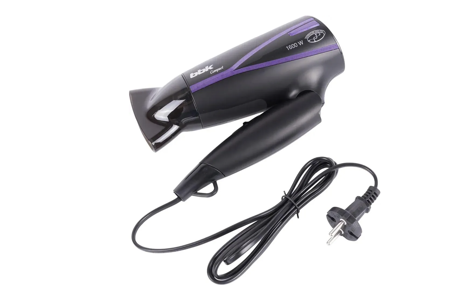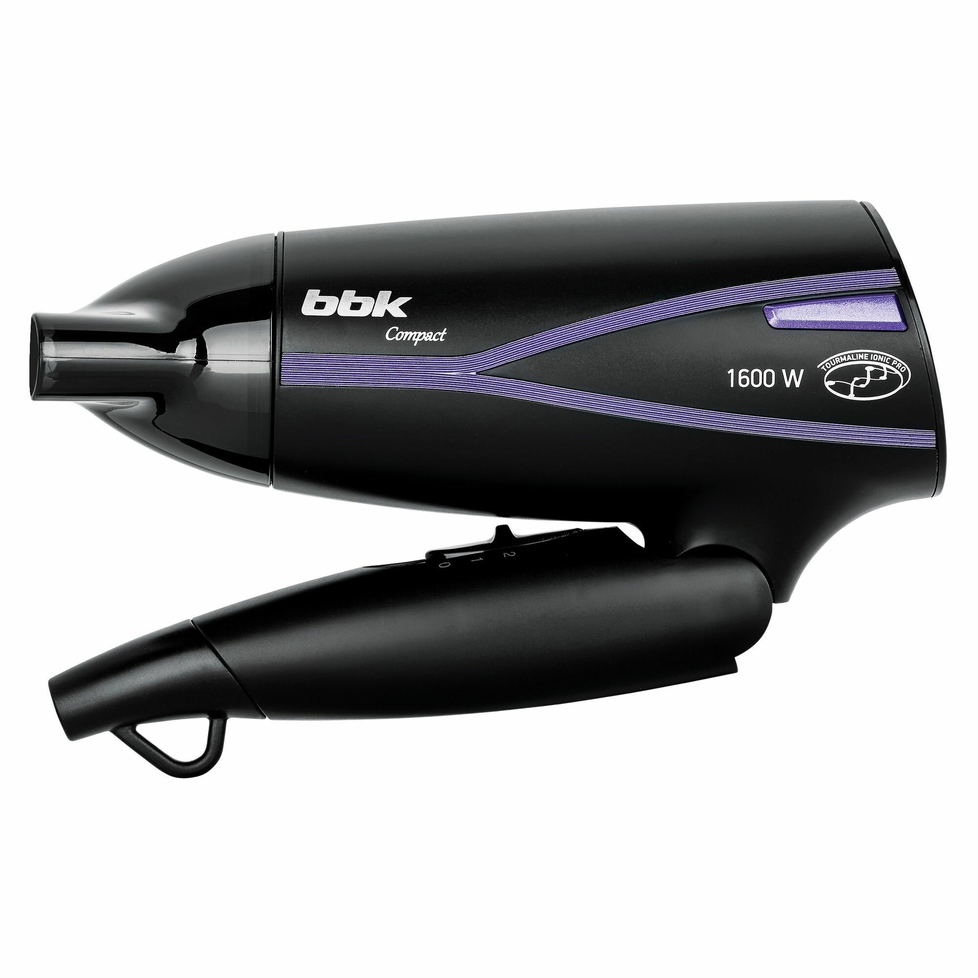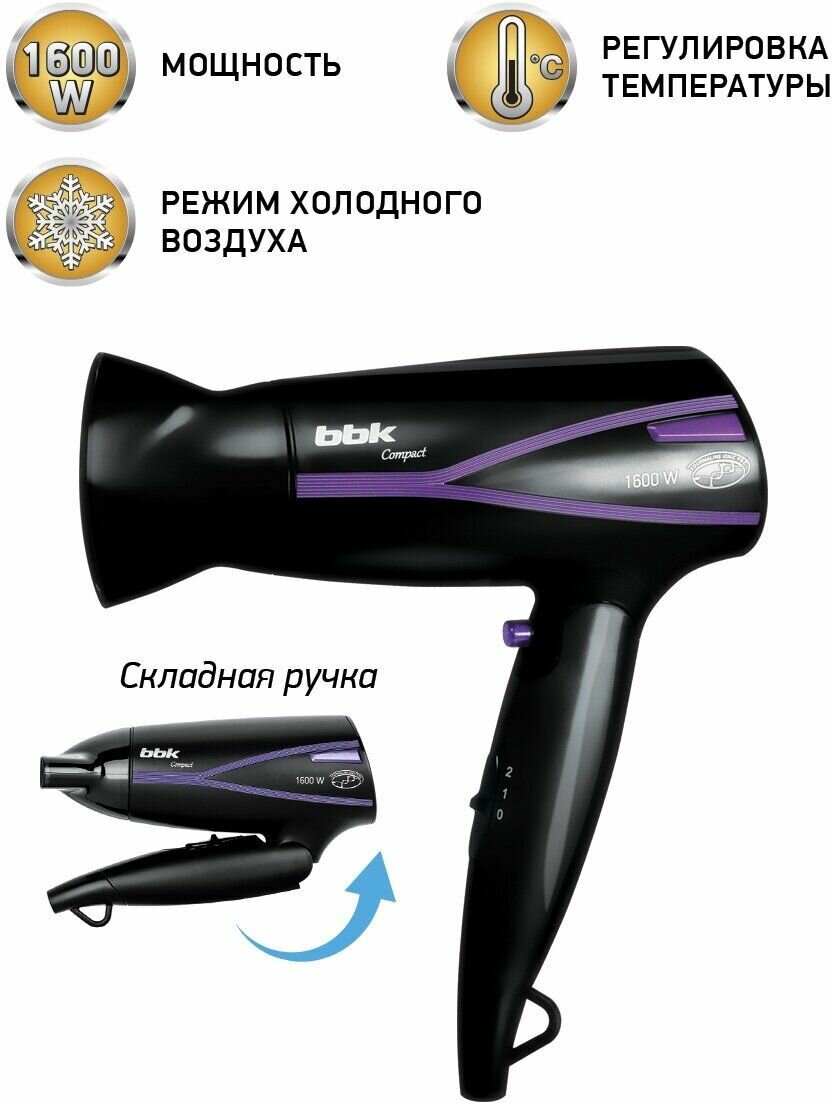 Фен для волос BBK BHD1608i черный/фиолетовый, мощность 1600 Вт, складная ручка