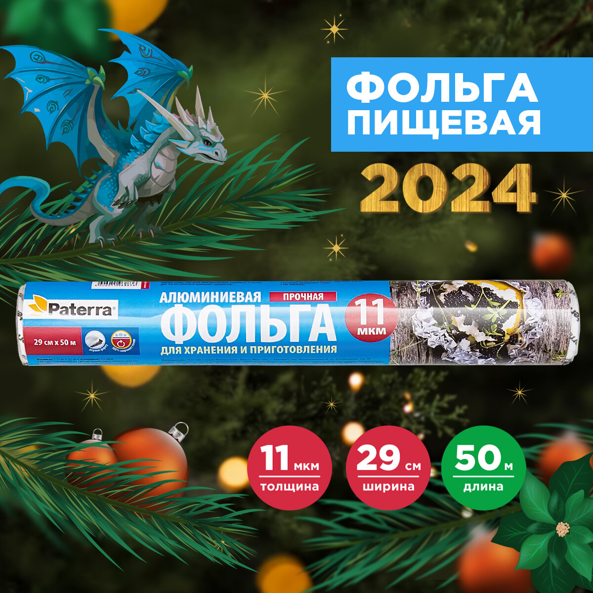 Пищевая фольга PATERRA прочная, 29 см, 50 м, рулон в пленке 209-016 интересное: