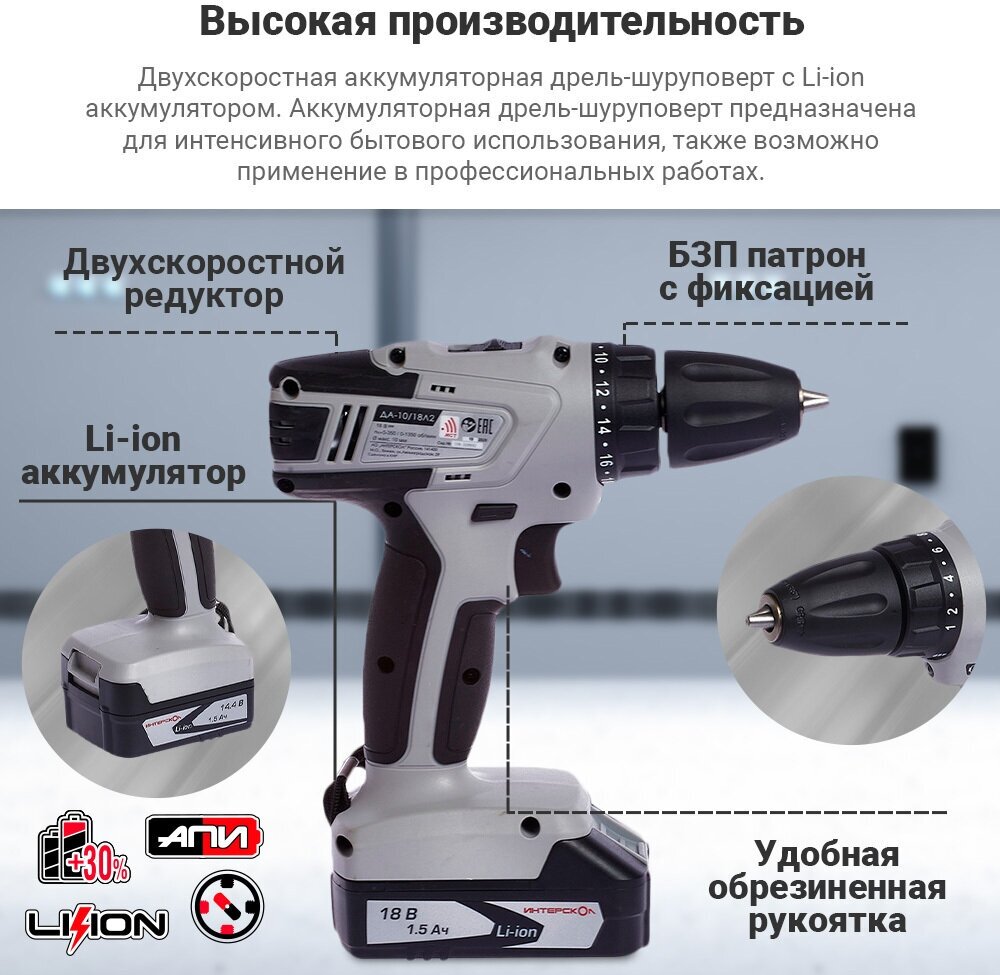 СохранитьАккумуляторная дрель ИНТЕРСКОЛ ДА-10/18 Л2 (518.0.2.00) интересное: