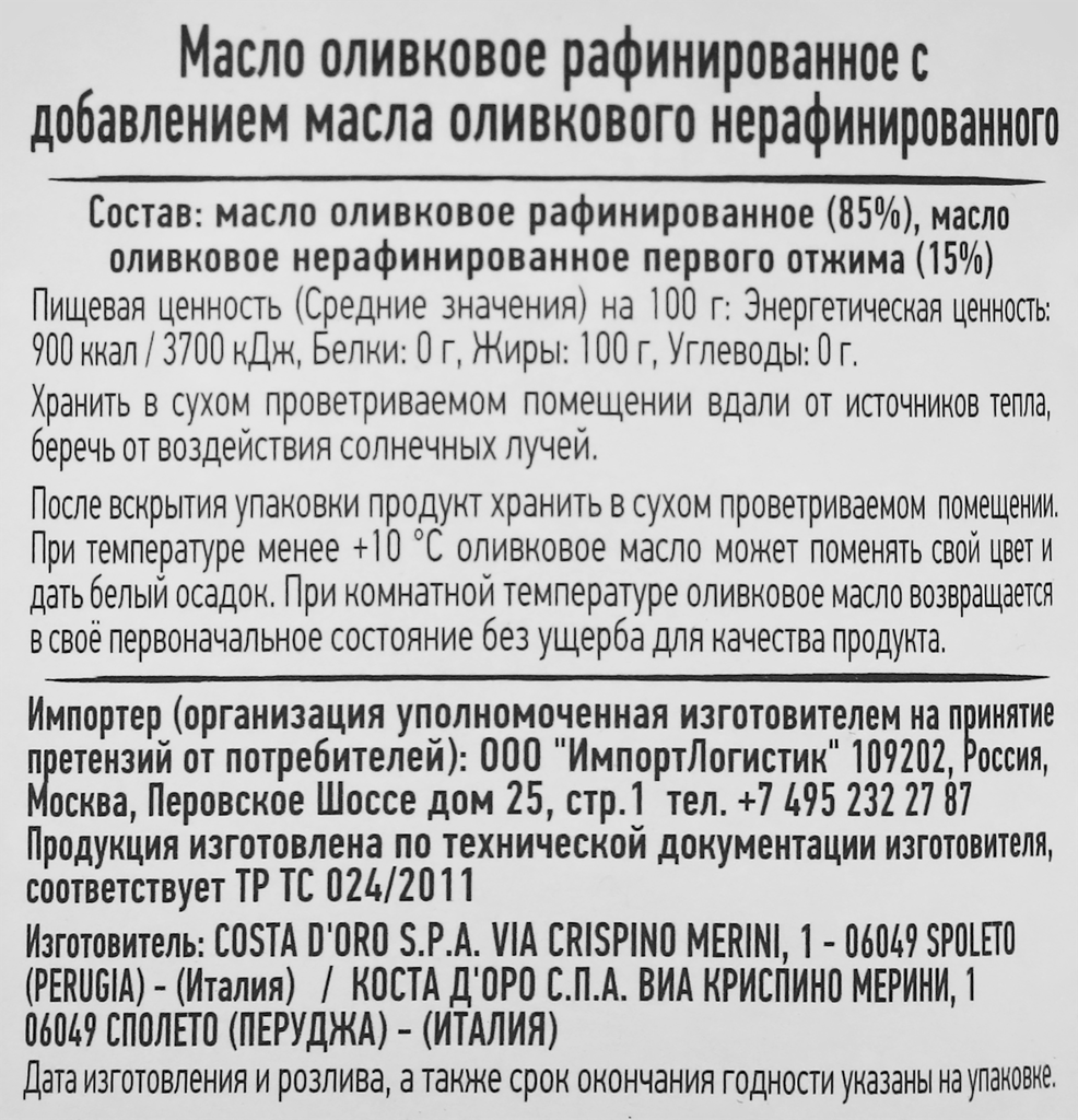 Масло оливковое COSTA D'ORO рафинированное с добавлением нерафинированного оливкового масла, 500мл