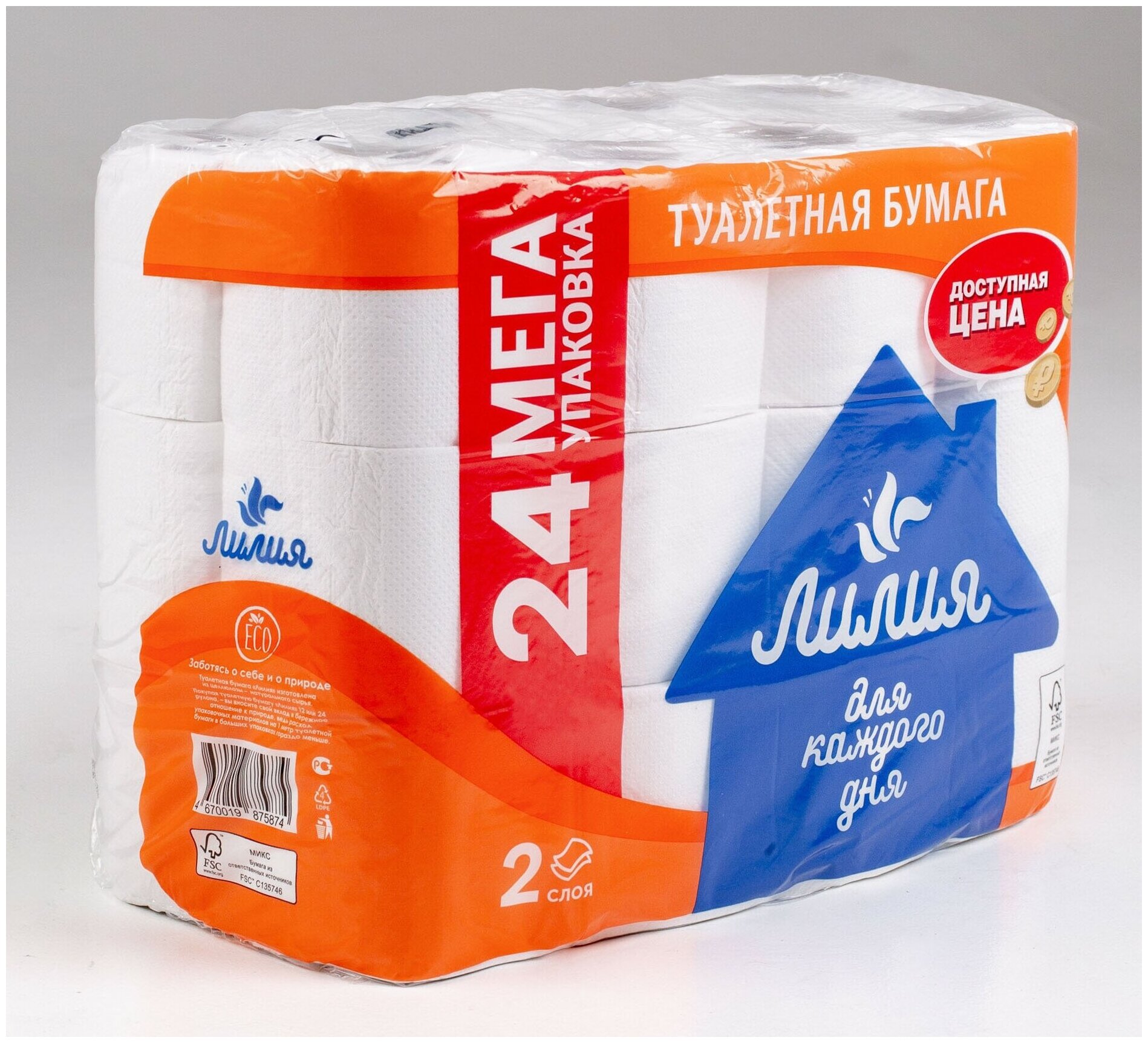 Туалетная бумага "Лилия", 2 слоя, 24 штуки в упаковке, цвет белый