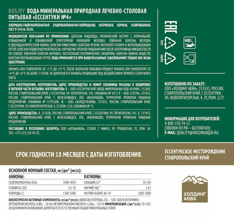 Вода минеральная лечебная Холдинг Аква Ессентуки №4, ПЭТ 1.5 л (6 штук)