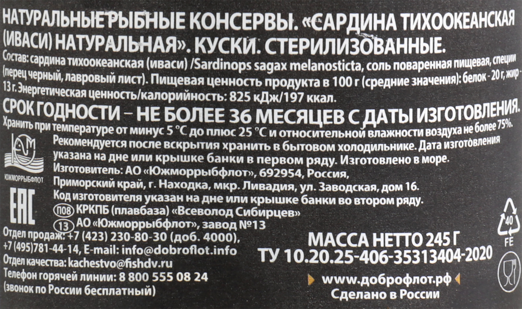 Сардина доброфлот тихоокеанская "" (иваси) натуральная 245 г