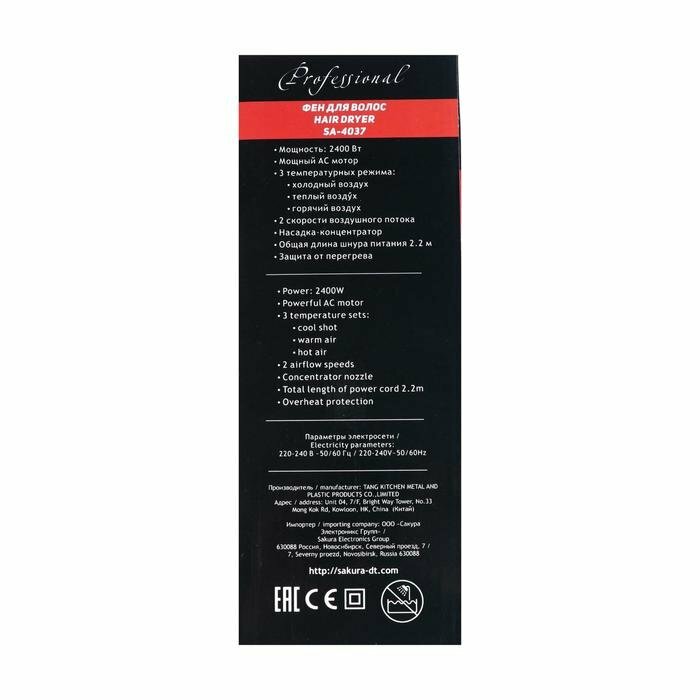 SAKURA Фен Sakura SA-4037BK, 2400 Вт, 2 скорости, 3 температурных режима, чёрный