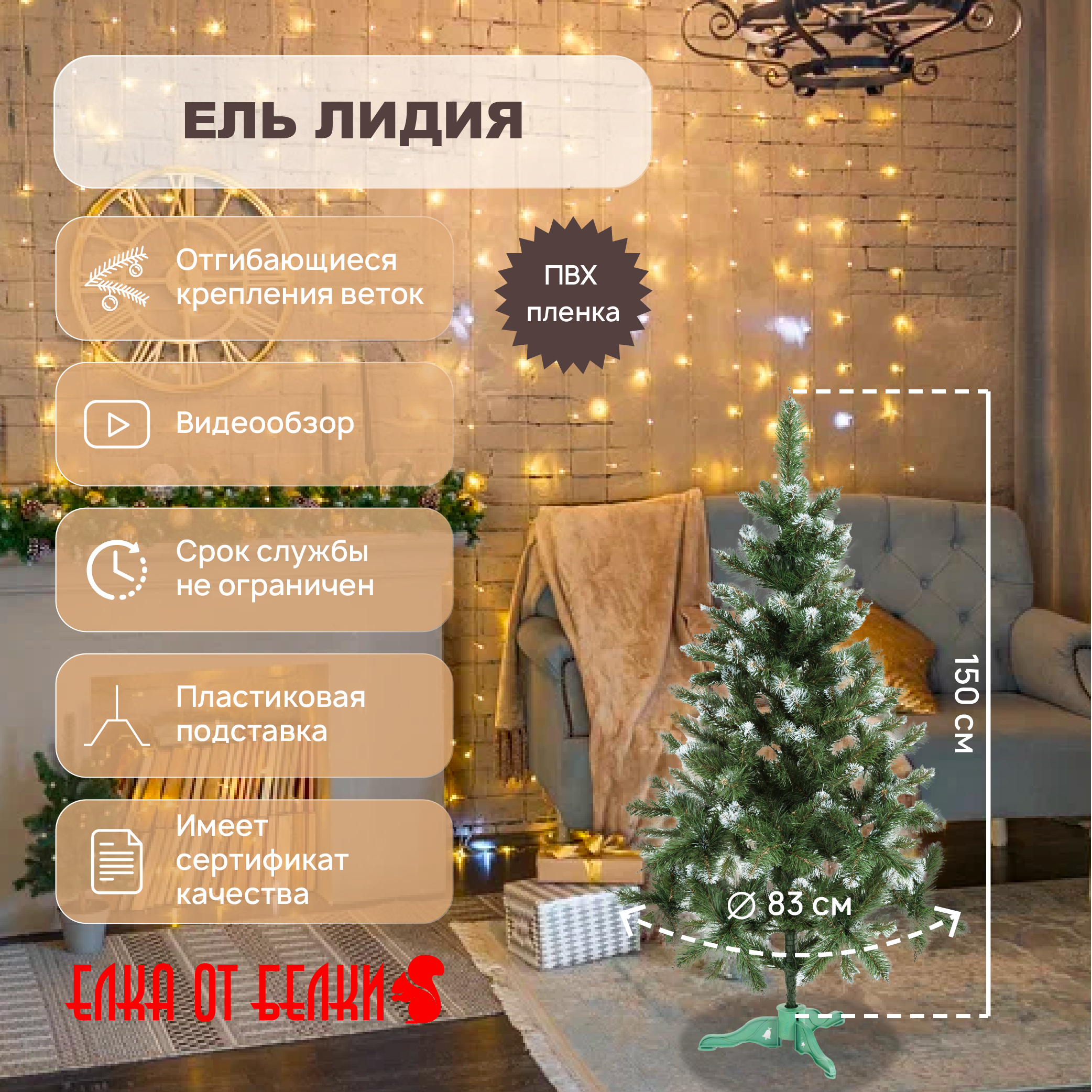 Искусственная Елка елка от белки, Лидия Из ПВХ, заснеженная много веток, 150 см
