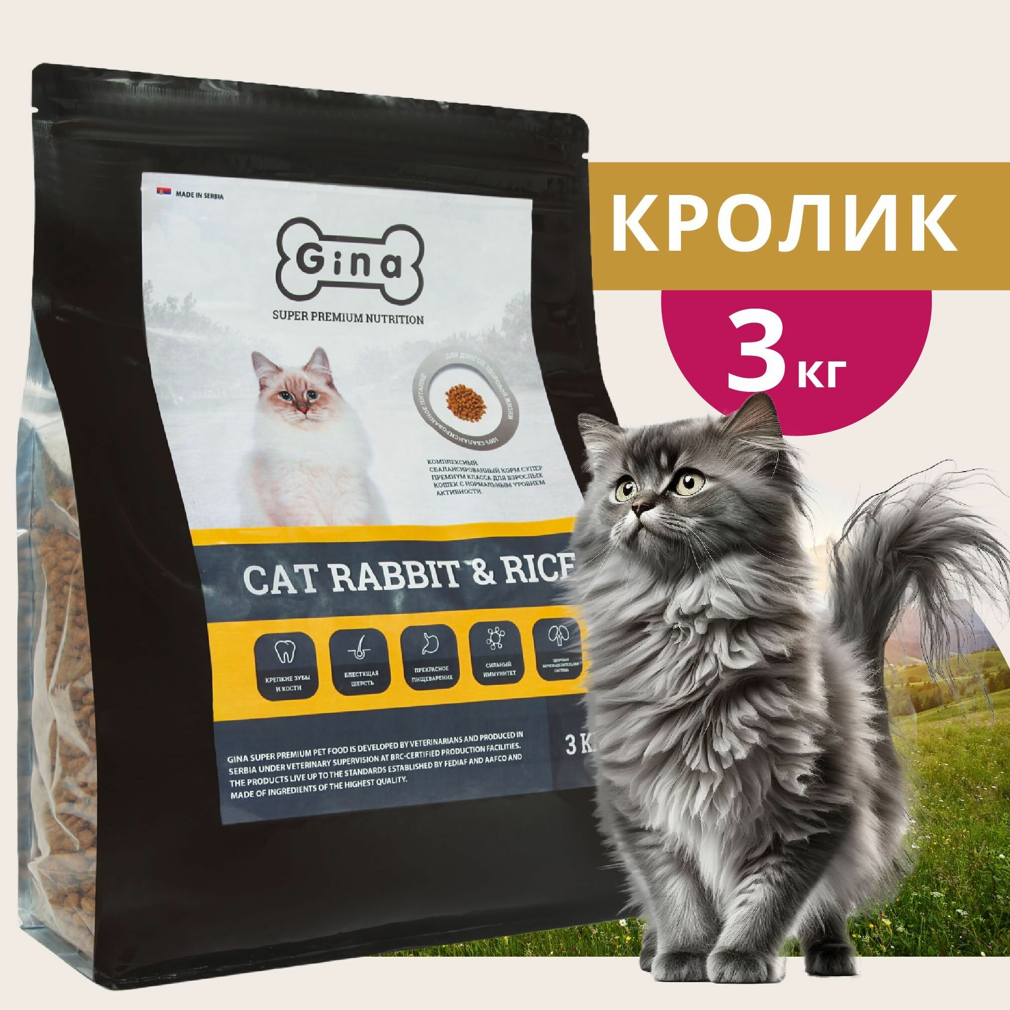 Сухой корм для кошек Gina с кроликом, с рисом 3 кг
