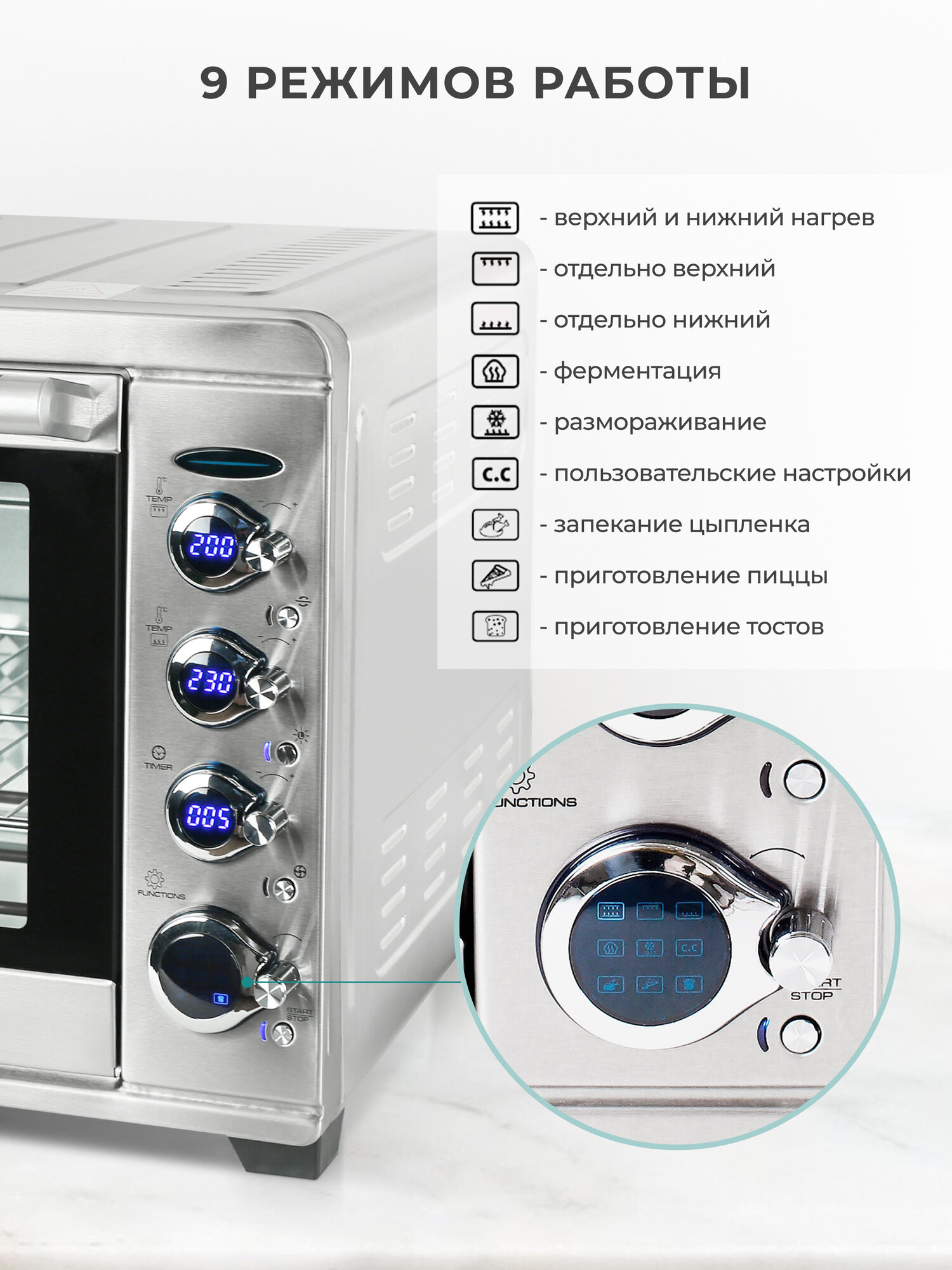 | Минусы: | Долго набирает температура. За 25 минут набирает 220 и это максимально. Быстро, сильно охлаждает при открывать дверь. |