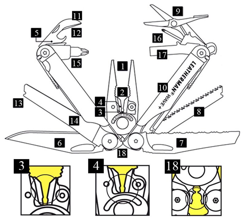 - нет люфтов при открытии. - все механизмы работают туго и четко фиксируются. - неплохая заводская заточка ножей и пилы. - как не странно, но хороший встроенный напильник - острогубцы, плоскогубцы и кусачки работают на 5+ |