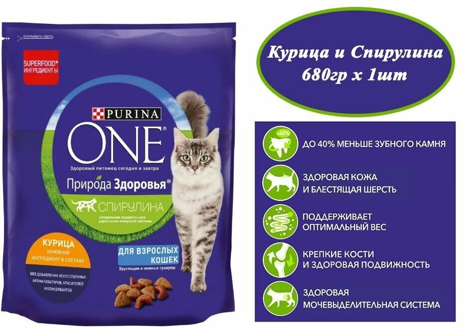 PURINA ONE Природа Здоровья 680 г сухой корм для взрослых кошек с высоким содержанием курицы и спирулиной