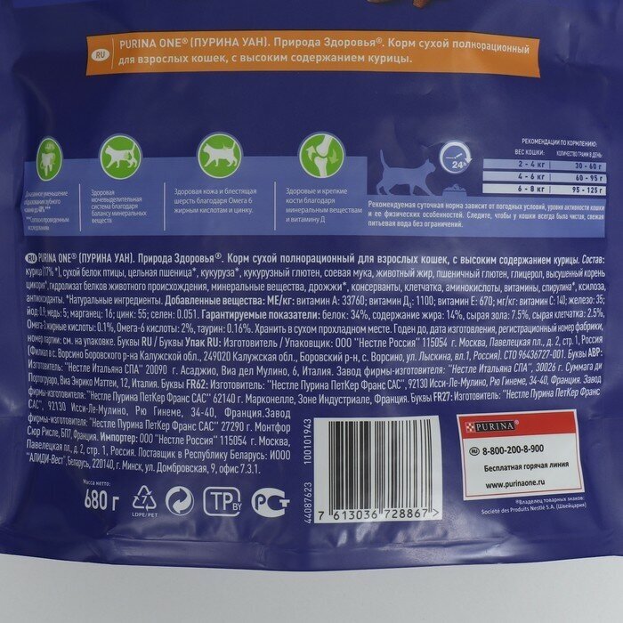 Корм сухой для взрослых кошек PURINA ONE Природа здоровья с высоким содержанием курицы, 680г