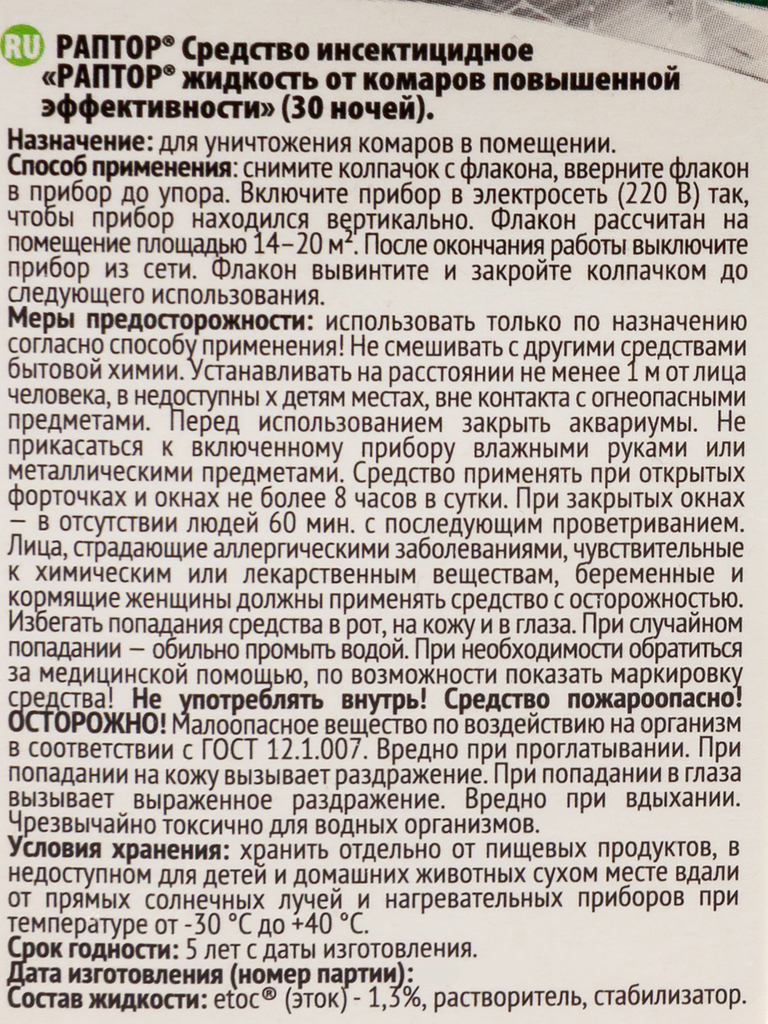 Комплект от комаров раптор повышенной эффективности: фумигатор и жидкость от комаров, 30 ночей, 2 шт.