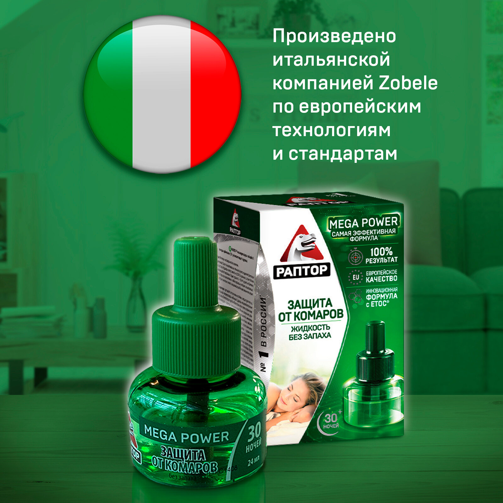 Жидкость для фумигатора Раптор от комаров повышенной эффективности Mega Power, 60 г, 24 мл, 30 ночей, зеленый