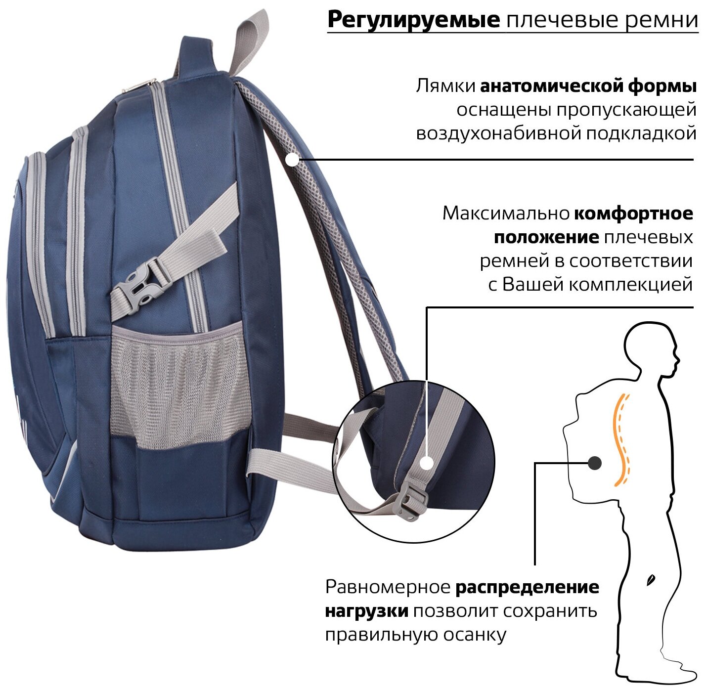 Рюкзак BRAUBERG HIGH SCHOOL универсальный, 3 отделения, «Старлайт», синий/серый, 46х34х18 см, 226342