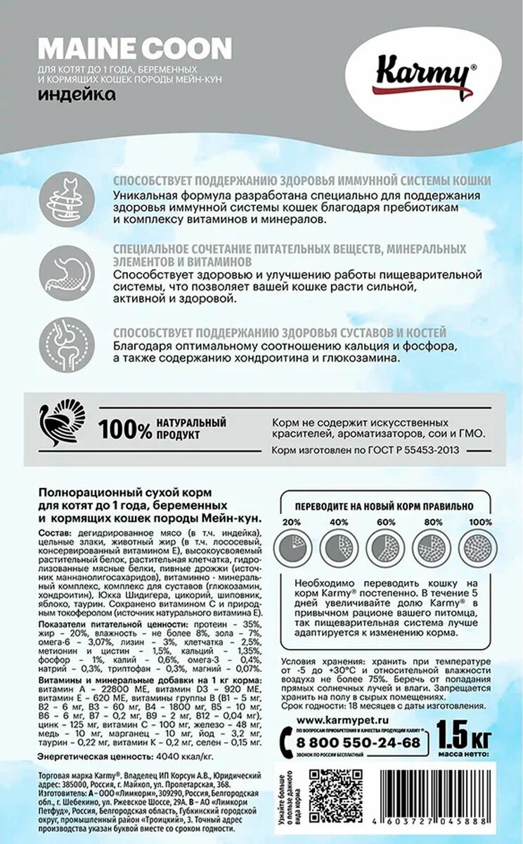 Корм Karmy Main Coon Kitten для котят породы мейн-кун, беременных и кормящих кошек, с индейкой, 1.5 кг
