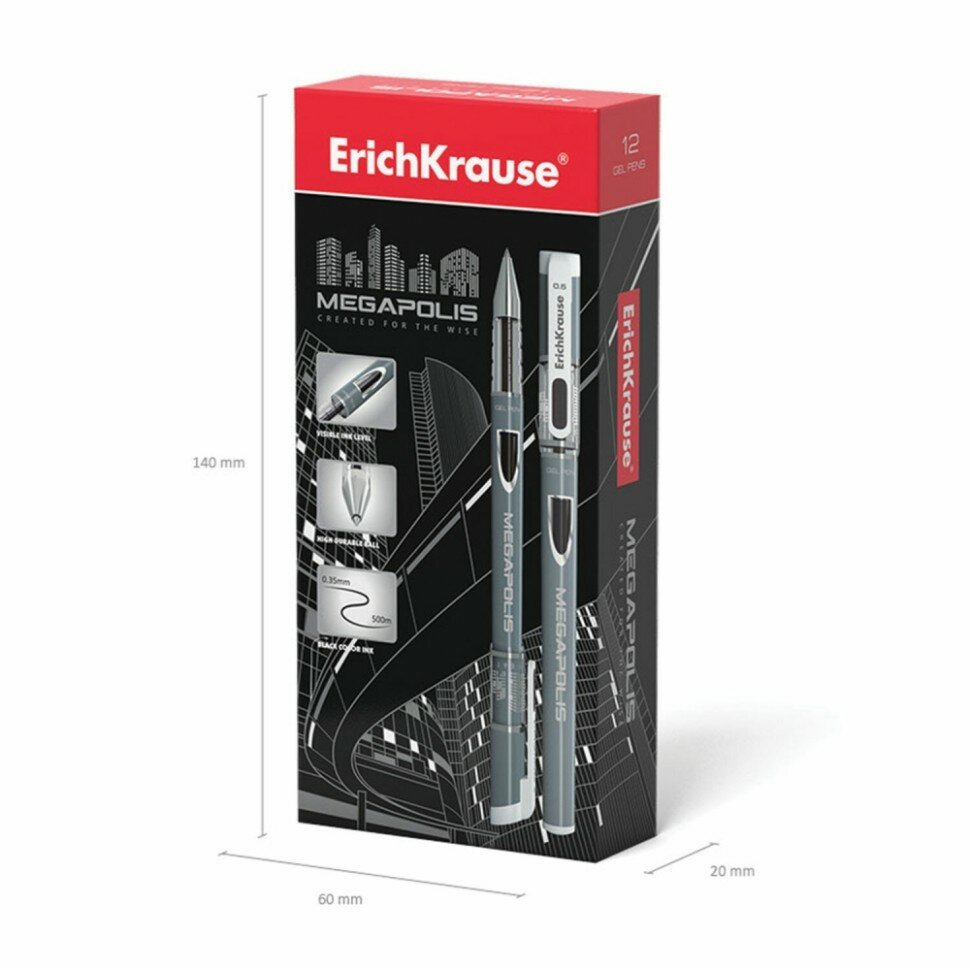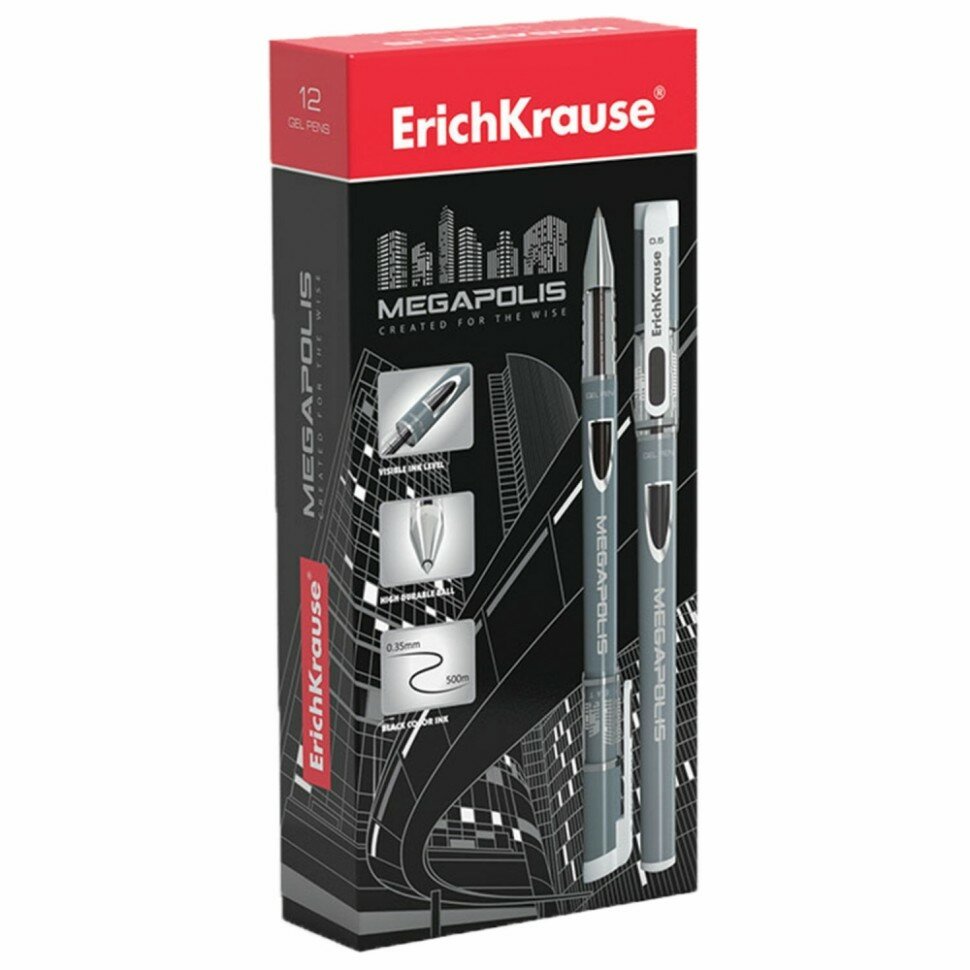 Ручка гелевая ERICH KRAUSE Megapolis Gel 0,5 мм, черная, 12штук