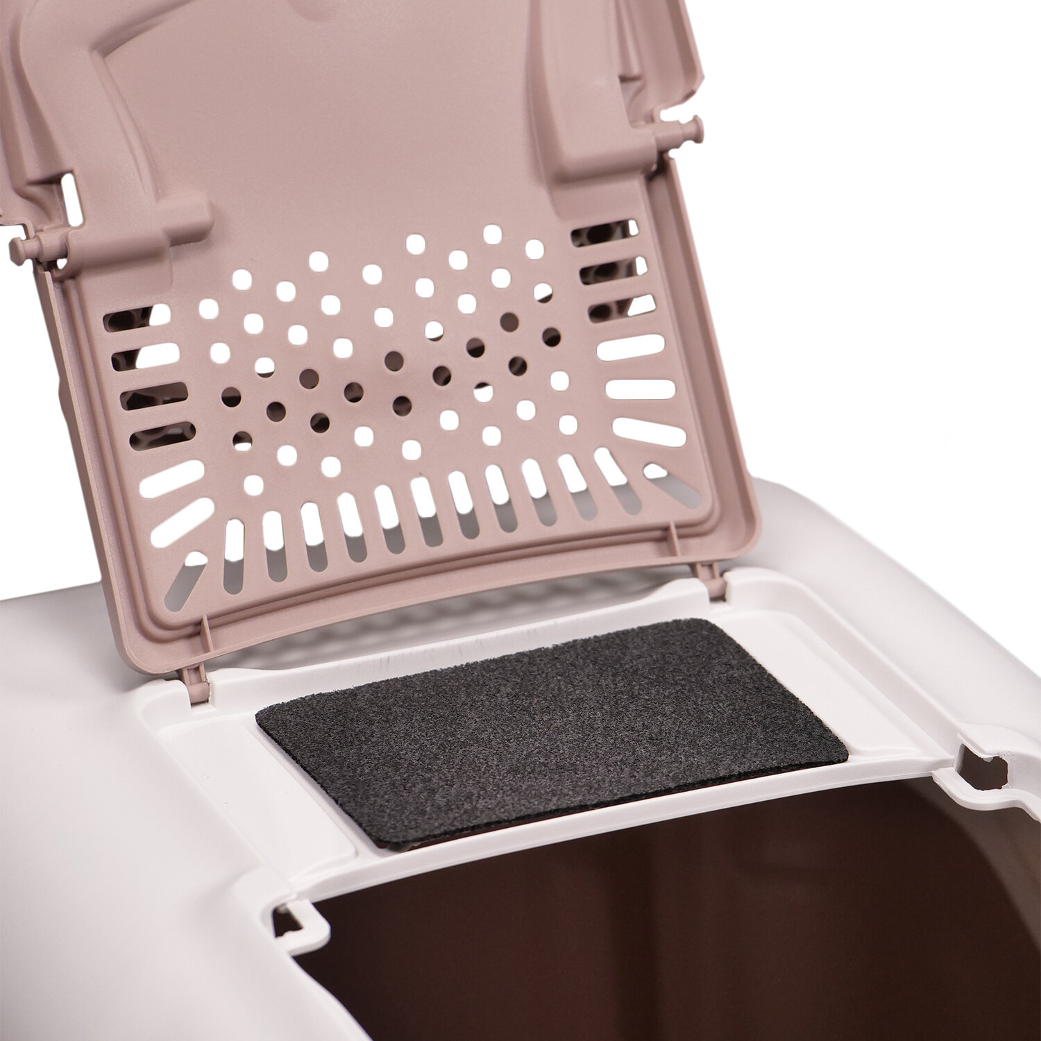 Есть перфорированный порожек для лапок чтобы сбить гранулы. Удобный туалет, все скрыто В первое время, кошка не выходила из туалета по пол часа игралась с чистыми гранулами... Если коротко, кошка заценила туалет по достоинству!) |