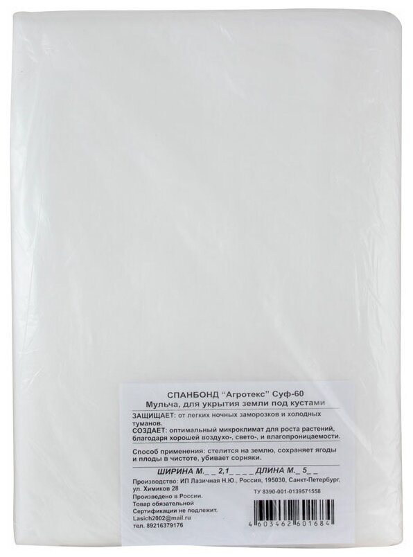 Укрывной материал спанбонд, плотность 17, размеры 1,6x10м, используется для мульчирования, защищает от вредителей и сорняков. Подходит для овощей, ягодных кустарников.