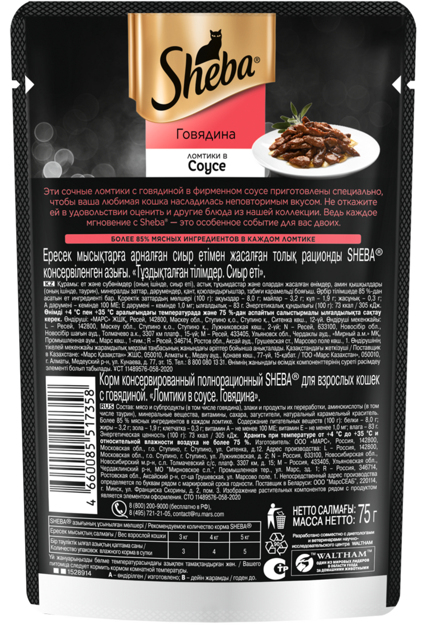 SHEBA 75гр Корм для кошек ломтики в соусе Говядина (пауч)