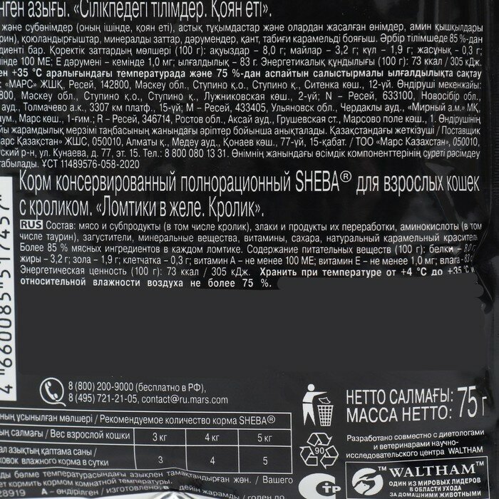 Консервы SHEBA для взрослых кошек ломтики в желе с кроликом 75 гр (75 гр х 28 шт)