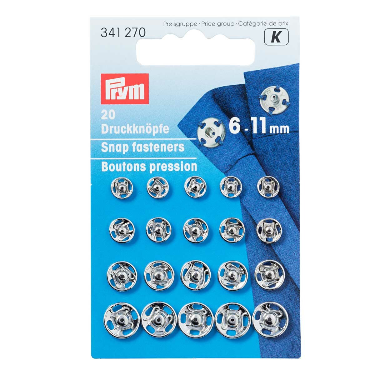 341270 Пришивные кнопки 6-11мм (латунь) упак(20шт), серебристый Prym
