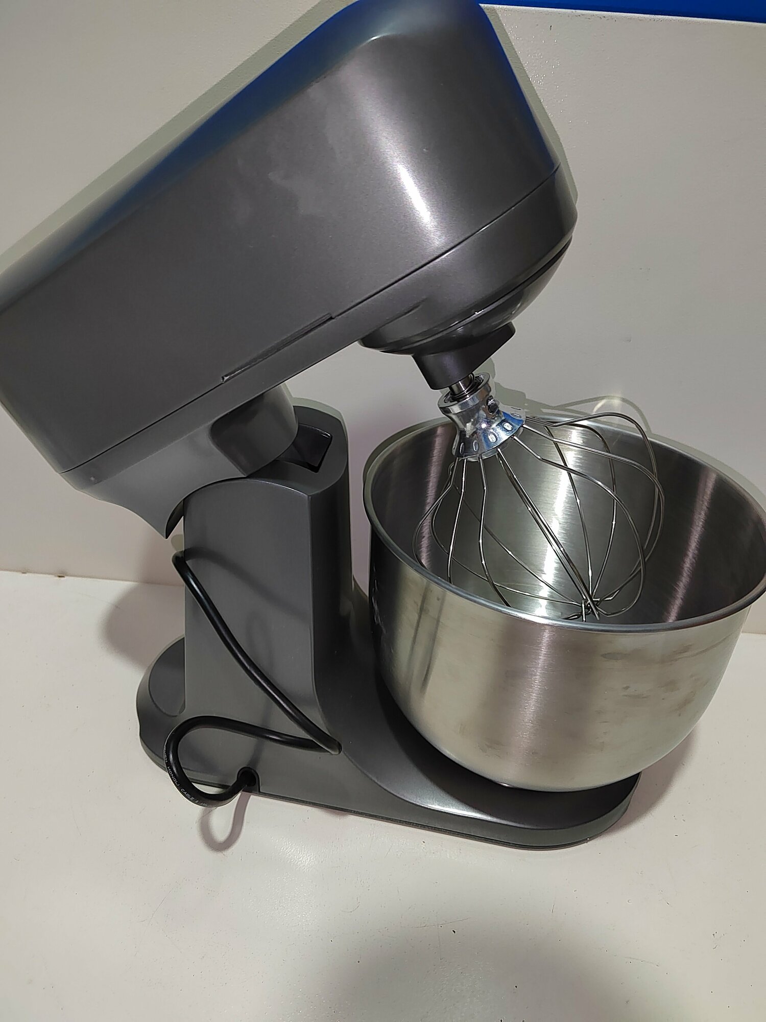 | Плюсы: | Миксер металлический, тёмно серого цвета, выглядит круто. Есть пластмассовые крышка, лопатка и сепаратор для яиц. Насадки (венчик, лопатка, крюк) и чаша металлические. Расстояния от насадок до дна чаши несколько миллиметров. Чаша большая, но довольно лёгкая, с удобной ручкой. |