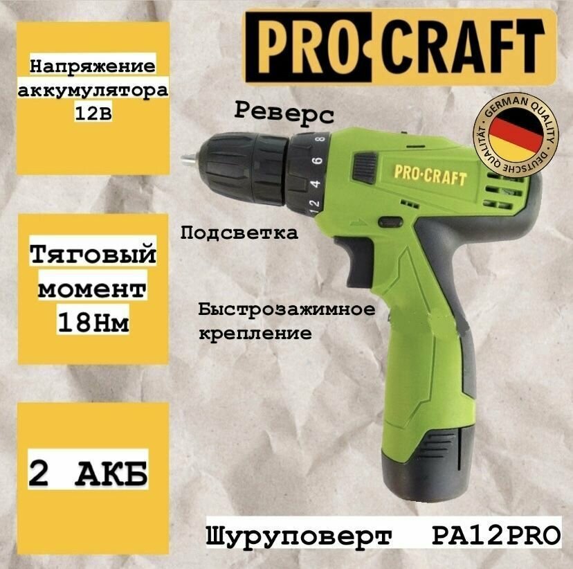 Шуруповерт Procraft PA12Pro, От аккумулятора, 12 В, 18 Нм, 2 АКБ