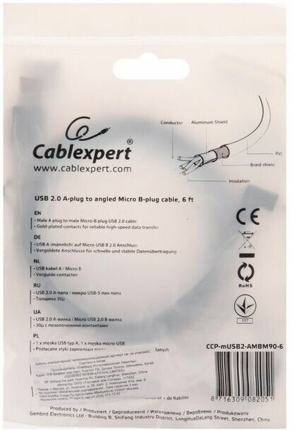 Кабель USB 2.0 A - micro USB 5pin (m-m), 1,8м угловой, экран Gembird CCP-mUSB2-AMBM90-6