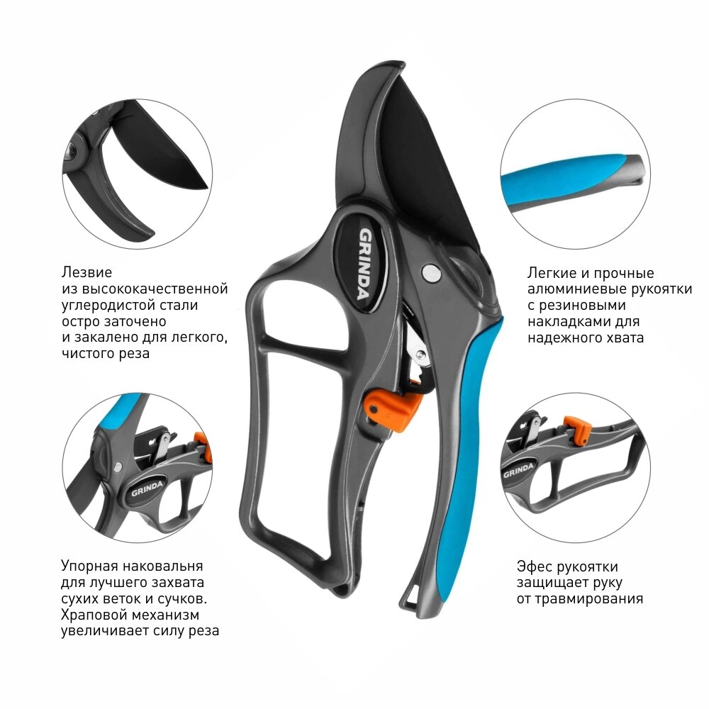 GRINDA P-33, 200 мм, закаленая сталь, с храповым механизмом, алюминиевые рукоятки с эфесом, контактный секатор, PROLine (423433)