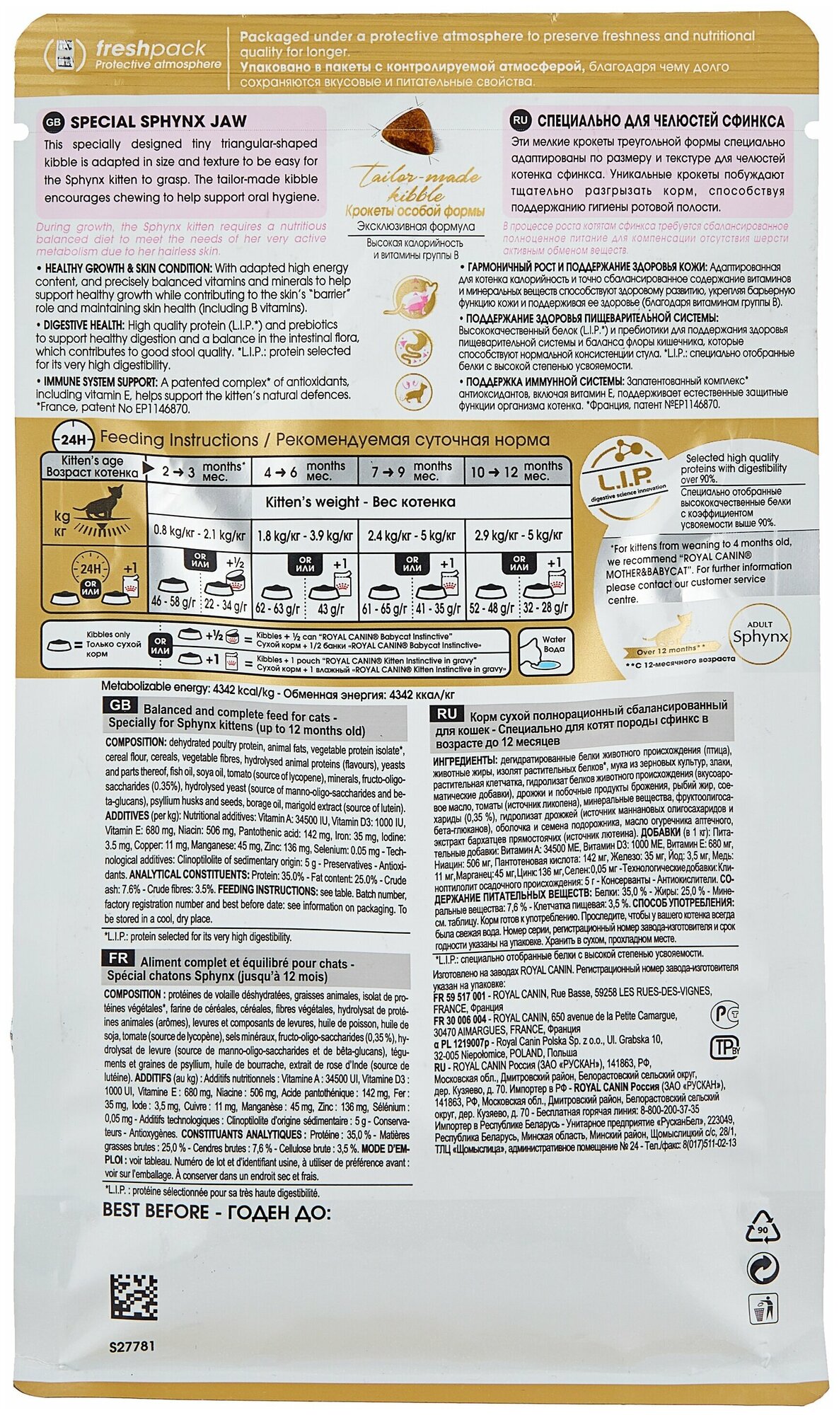 Купить Корм сухой Royal Canin Sphynx Kitten для котят породы сфинкс в возрасте до 12 месяцев, 400 г